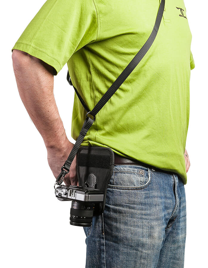 The Side Holster with Sliding Tether is designed for all levels of photographers, from amateur to pro, and for casual to moderate use. When added to the Cotton Carrier lens bag and belt systems, the Side Holster allows photographers to carry two cameras at once. Add the Side Holster to a 2 Camera Vest, and photographers can safely carry three cameras on one Camera Vest.
