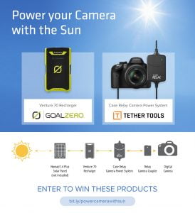 There are 9 different ways to enter the giveaway. Most of them involve visiting Tether Tools and/or Goal Zero on Facebook, Instagram, Twitter, and YouTube. Someone will win a Venture 70 Recharger from Goal Zero and a Case Relay Camera Power System from Tether Tools.