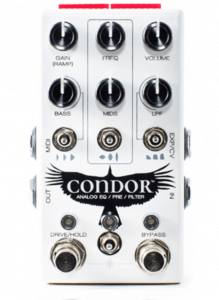 The Condor is an analog multi-effect that allows sophisticated control over a wide range of effects including EQ, overdrive, boost, tremolo and filter tones. The pedal has a powerful parametric mids control that ranges from 150Hz to 5kHz along with a three separate low pass filter or bass boost/cut modes. Along with expansive frequency controls, Condor has gain and volume knobs and a switchable overdrive circuit for sculpting your idea guitar tone.