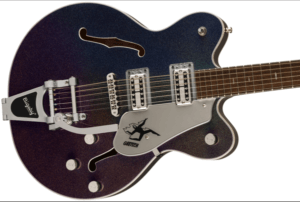 Equipped with USA Full’Tron hum bucking pickups, the guitar delivers a powerful and versatile sonic range. The control layout includes a master volume with treble bleed circuit, master tone, individual pickup volume control and a three-position pickup selector switch, offering precise tonal shaping. The Anchored Adjusto-Matic bridge ensures stable tuning while the Bigsby B70 vibrato tailpiece adds expressive pitch modulation. Additional features include a Graph Tech NuBone nut, silver sparkle binding, locking tuners, strap locks and nickel hardware.