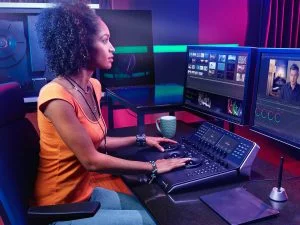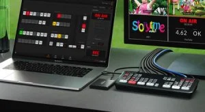 ATEM Mini’s compact all in one design includes both a control panel as well as connections. The front panel includes easy to use buttons for selecting sources, video effects, and transitions. The source buttons are large so it’s possible to use it by feel, letting the presenter do the switching. Customers even get buttons for audio mixing. Customers also get buttons for record and streaming control, as well as output buttons that let customers change the video output between cameras, program and multiview. On the rear panel there are HDMI connections for cameras or computers or even gaming consoles, extra microphone inputs, USB for webcam out plus an HDMI “aux” output for program video.